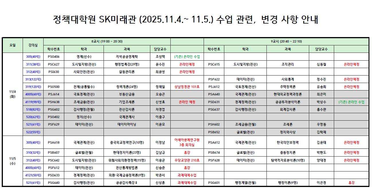 - 11월 4일(화): SK미래관 4층과 5층은 수업 가능 (3층 수업 불가)